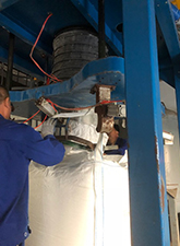 中国工場での1トンフレコンの梱包作業の様子です。1つ1つ梱包を行っております。